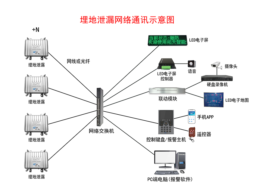 埋地泄漏入侵報警系統示意圖——網絡通訊+LED電子屏+語音